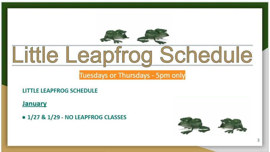 We teach ages 3* and up, including an adult class. Our class locations and times are: