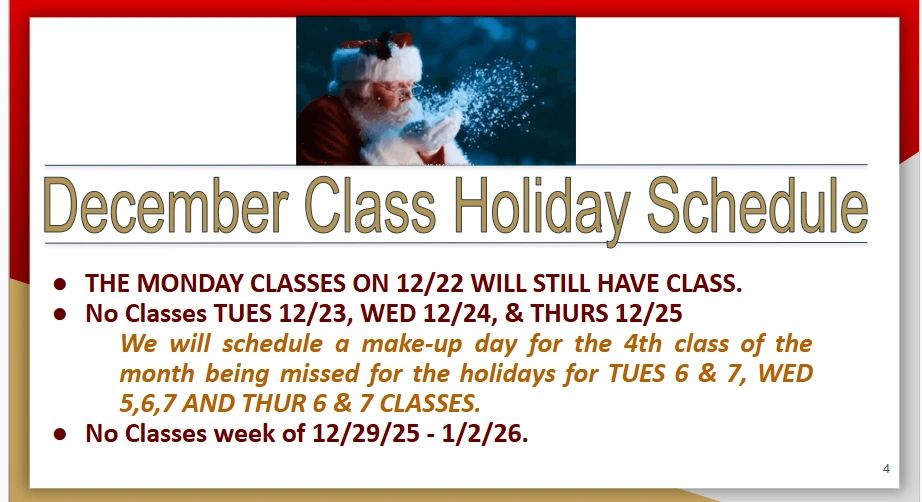 We will invoice monthly tuition before the 1st of each month. You will receive an email by mid to late August with info and class day/time will be on the month's invoice. They are placed in classes in order of registration fee received. Once classes are full, we will place them on a waiting list and then add them to classes as space opens up. FOR RETURNING STUDENTS, PLEASE UPDATE SKILL LEVEL IN THE CLASS MANAGER PORTAL.